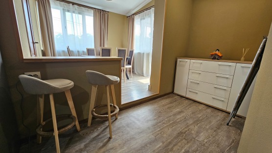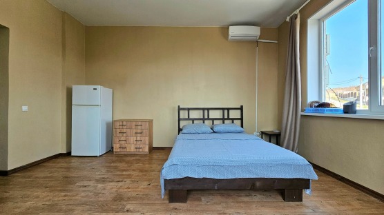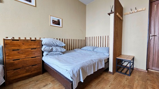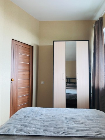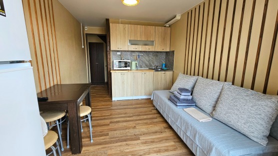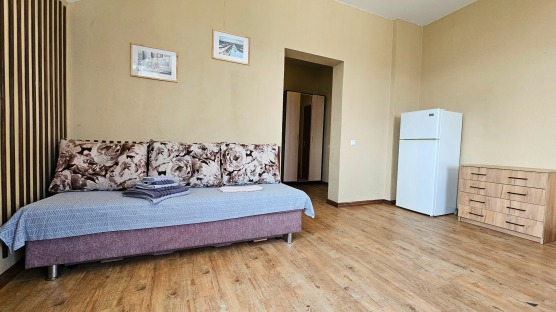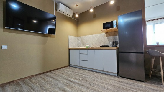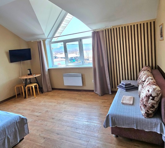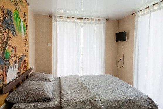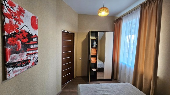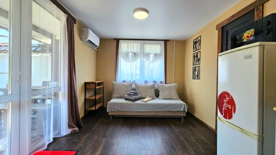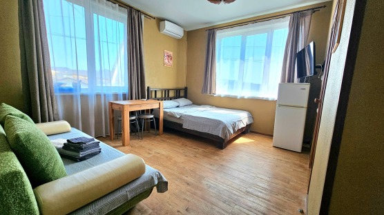 В номере: двуспальная кровать и двуспальный раскладной диван, шкаф, чайный столик, камод, кондиционер, кухня для самостоятельного приготовления, телевизор, холодильник, микроволновка, чайник, посуда и столовые приборы на 4 персоны, душ, туалет, умывальник.