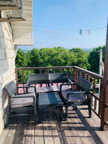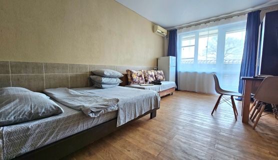 В номере: современный ремонт, мебель, кондиционер, телевизор, холодильник, стол, стулья, кухонная зона, микроволновка, чайник, эл.плитка, посуда, стиральная машина, фен, балкон с шезлонгами, красивый вид с балкона.